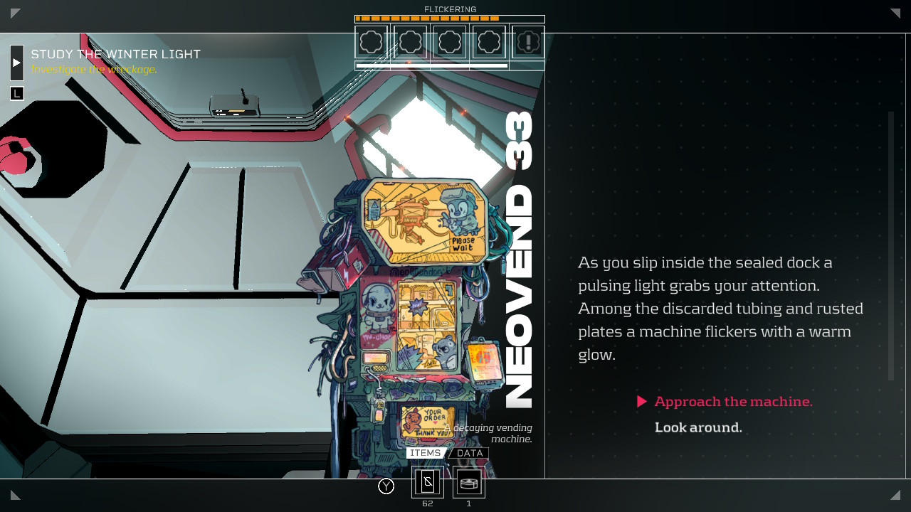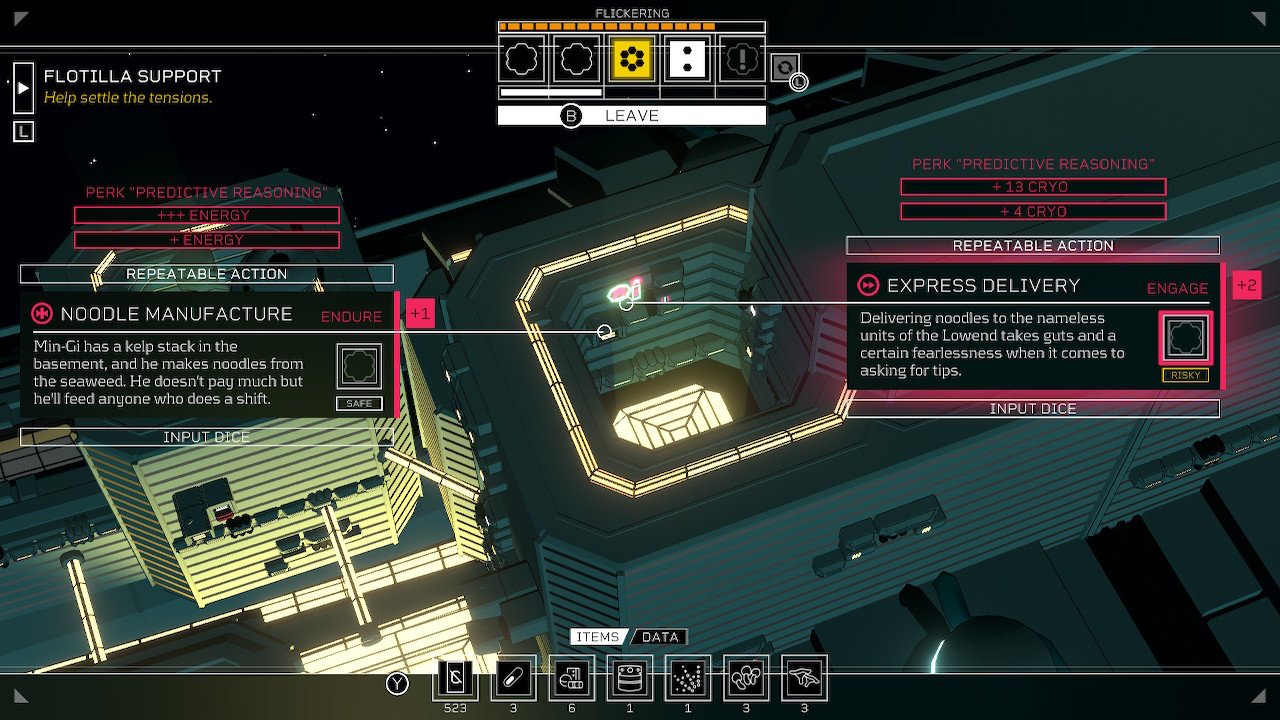 Let me rewind a little and explain. In the world of Citizen Sleeper you play as one of three ‘sleepers’: a digital copy of a human housed within a mechanical body that does not belong to you, but the corporation who made you. At the beginning of the game you have escaped your fate and landed on Erlin’s Eye. A circular waystation on the edge of a solar system that is in economic and moral collapse. The tagline for the game is “Roleplaying in the ruins of interplanetary capitalism”. If we’re living in late-stage capitalism now then this is late-stage capitalism to the power of ten. And because of this and the fact that you are placed in a body that has in-built obsolescence you must find work to earn credit so you can buy food and the life-saying medicine that prevents your body from shutting down. Over time your condition will degrade limiting the number of actions you can take in a day. Likewise not eating to restore your energy causes your condition to fall faster, as can failing certain risky tasks.