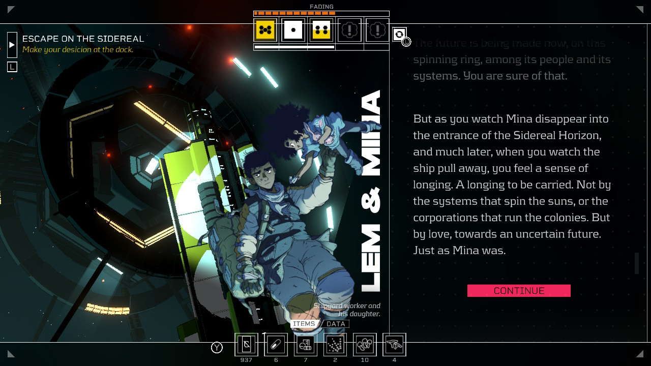 There are very few villains in Citizen Sleeper. Most people are just trying to get by as best they can (you included). And in nearly all instances your faith and trust in people is rewarded. This felt like a game that wanted me to succeed despite setting me up at the beginning with what looked like a hopeless situation. Never have I wanted so much to play a game, not to beat it, but to pay back the kindness that I had been bestowed on me.