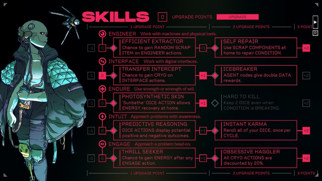 These tasks and the story beats that accompany them are played out in dice rolls. At the beginning of each day you receive a set number of dice depending on your overall condition. The worse off your body is the fewer dice you receive. If you’re familiar with ‘spoon theory’ you already understand how this works. It is here that a risk vs reward strategy comes into play. Depending on how good the dice rolls are will influence the outcome of the actions you choose to do. The higher the number the less risky the action and the more certain you can be of a postive or neutral outcome. Eventually, you will earn abilities that boost your dice rolls or even allow you to re-roll them, but in the early game every roll, and every negative outcome counts. And because of this, any decision you make that does not immediately benefit you, either through earning you credits or food, is not to be taken lightly.