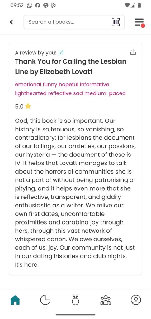 The paperback of my book Thank You For Calling the Lesbian Line is out now, which means it’s just over a year since the book first published. In many ways it’s been a normalish three-hundred-and-seventy-one ish days for me since the book was out (life & work continues!) and in many ways it’s very much NOT been a normal time of my life. Publishing a book doesn’t change your life but it is something very special; it’s the culmination of a lot of hard work and belief – not just yours, but a whole group of people around you to turn something in your head into something that can be held in someone else’s hands. It’s not a perfect book, but I did my best, and that’s all I think we can ask for. And now it’s out in a more portable format than ever.